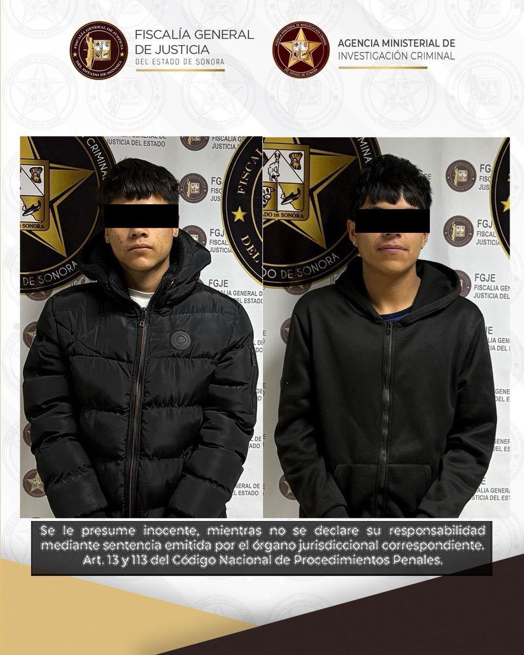 Nogales, Sonora, 4 de enero de 2026.- La Fiscalía General de Justicia del Estado de Sonora (FGJES), por medio de la Agencia Ministerial de Investigación Criminal (AMIC), efectuó la captura de dos sujetos en cumplimiento de órdenes de aprehensión por el delito de lesiones graves que ponen en peligro la vida, siendo los señalados vinculados a proceso en audiencia ante el Juez.