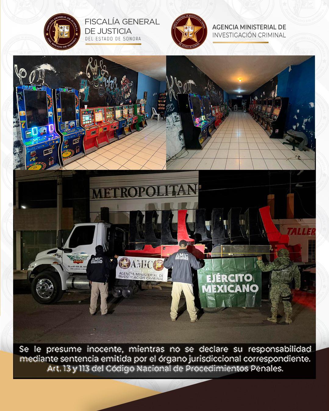 Hermosillo, Sonora, 20 de enero de 2026.- La Fiscalía General de Justicia del Estado de Sonora (FGJES), a través de la Agencia Ministerial de Investigación Criminal (AMIC) y en coordinación con la Secretaría de Seguridad y Protección Ciudadana (SSPC), la Secretaría de la Defensa Nacional (DEFENSA) y la Policía Estatal de Seguridad Pública (PESP), realizó diversos operativos en la varios sitios del Estado que derivó en el aseguramiento de 78 máquinas tragamonedas.